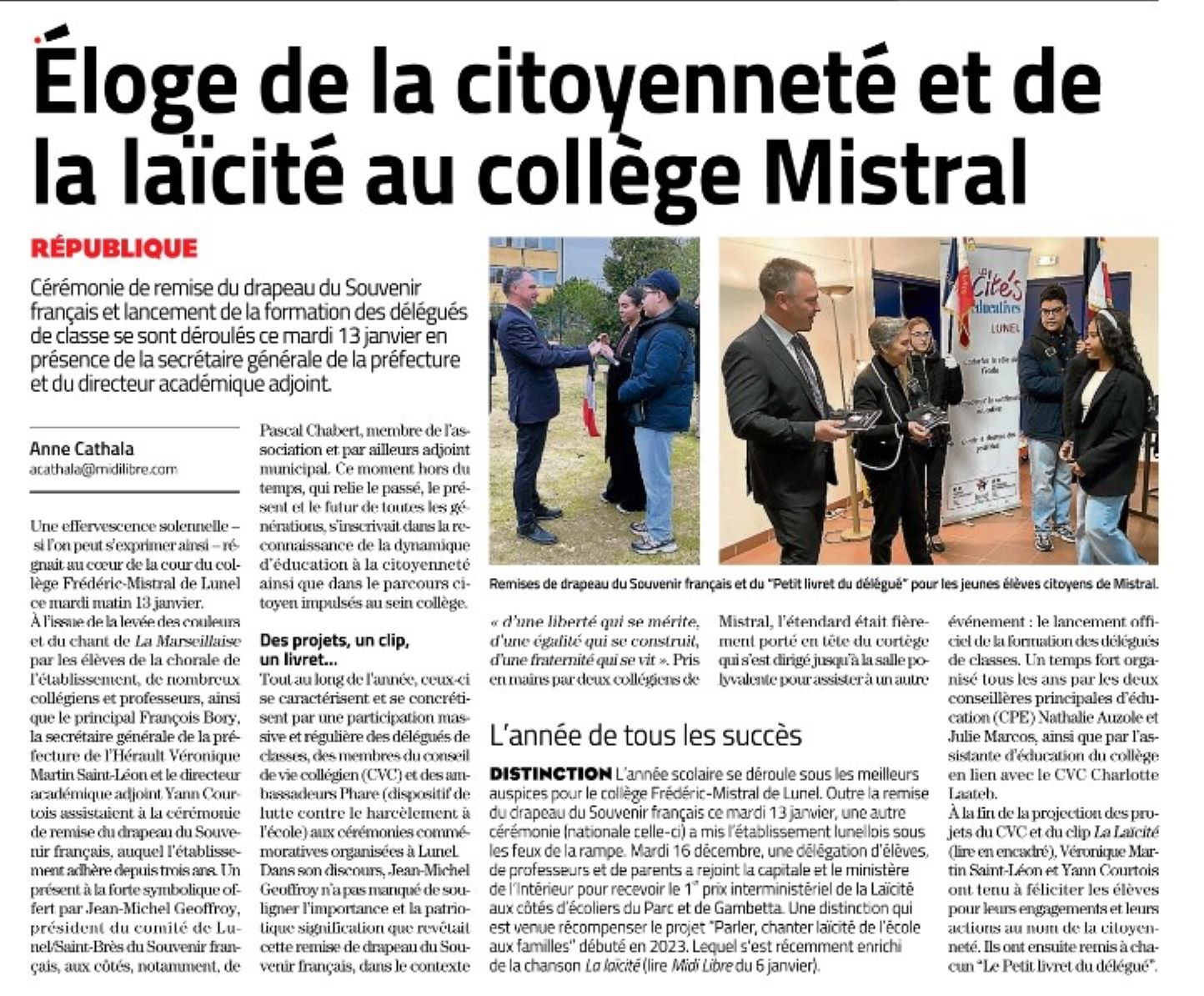 Retenons également la remise officielle du drapeau du Souvenir Français aux élèves de Mistral. Transmission qui salue et illustre le fort niveau d’implication des délégués du collège, également très mobilisés et remarquablement accompagnés dans le cadre du Conseil de Vie du Collégien et des Ambassadeurs Phare.